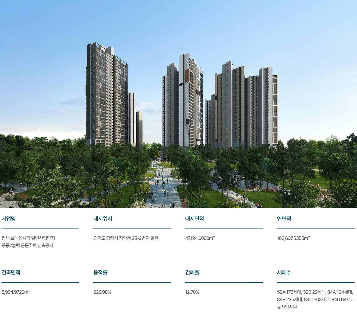 평택의 핵심 자족 신도시인 브레인시티에 위치하며 약 1,000세대의 랜드마크 규모로 조성되는 고품격 아파트입니다.